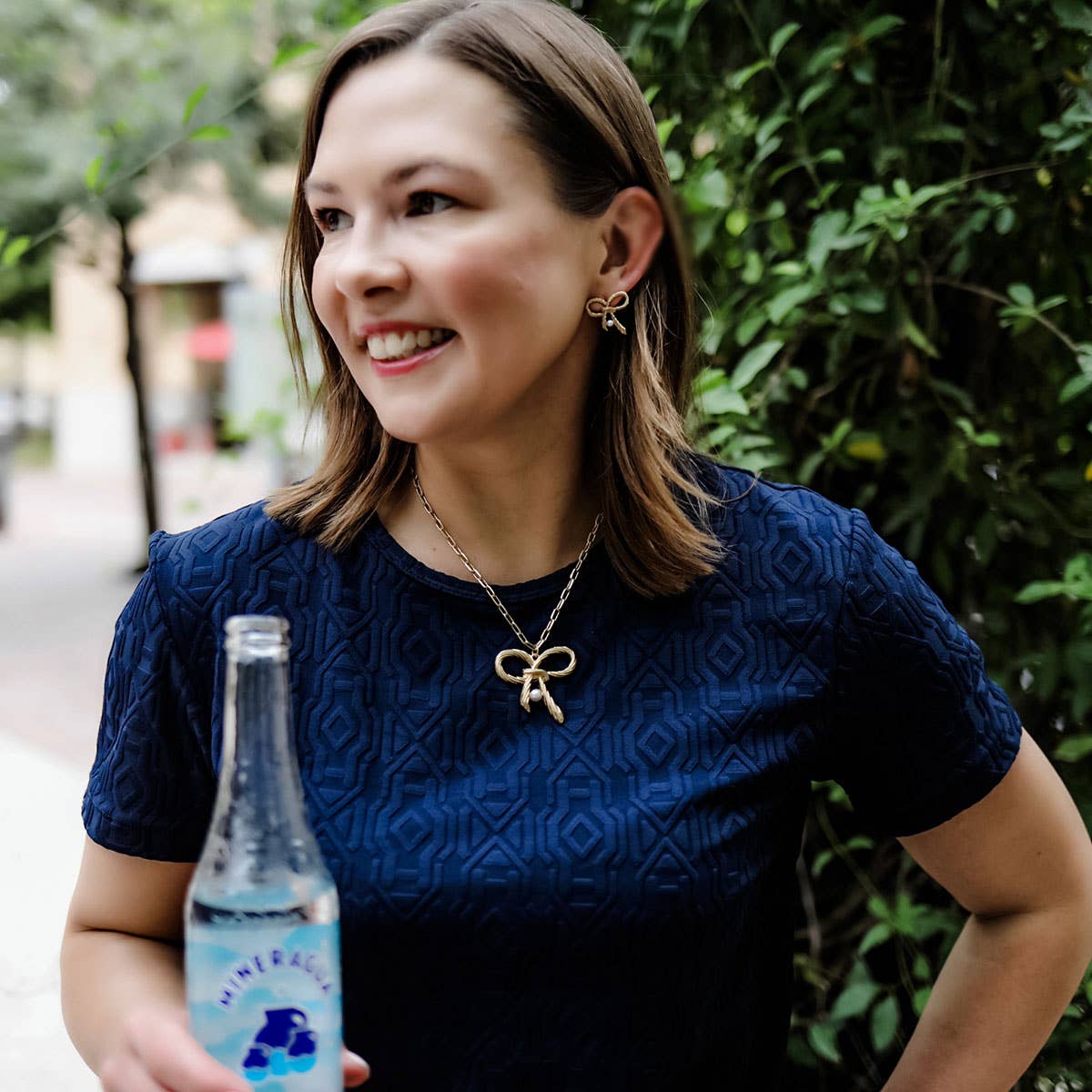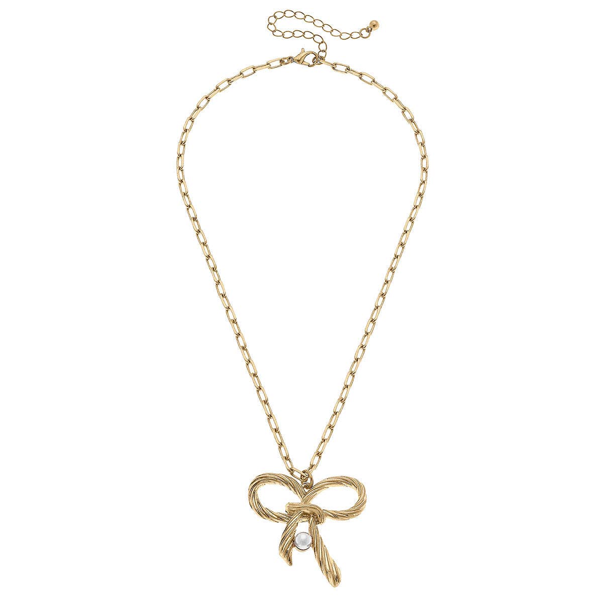 Amy Bow & Pearl Pendant Necklace in Worn Gold