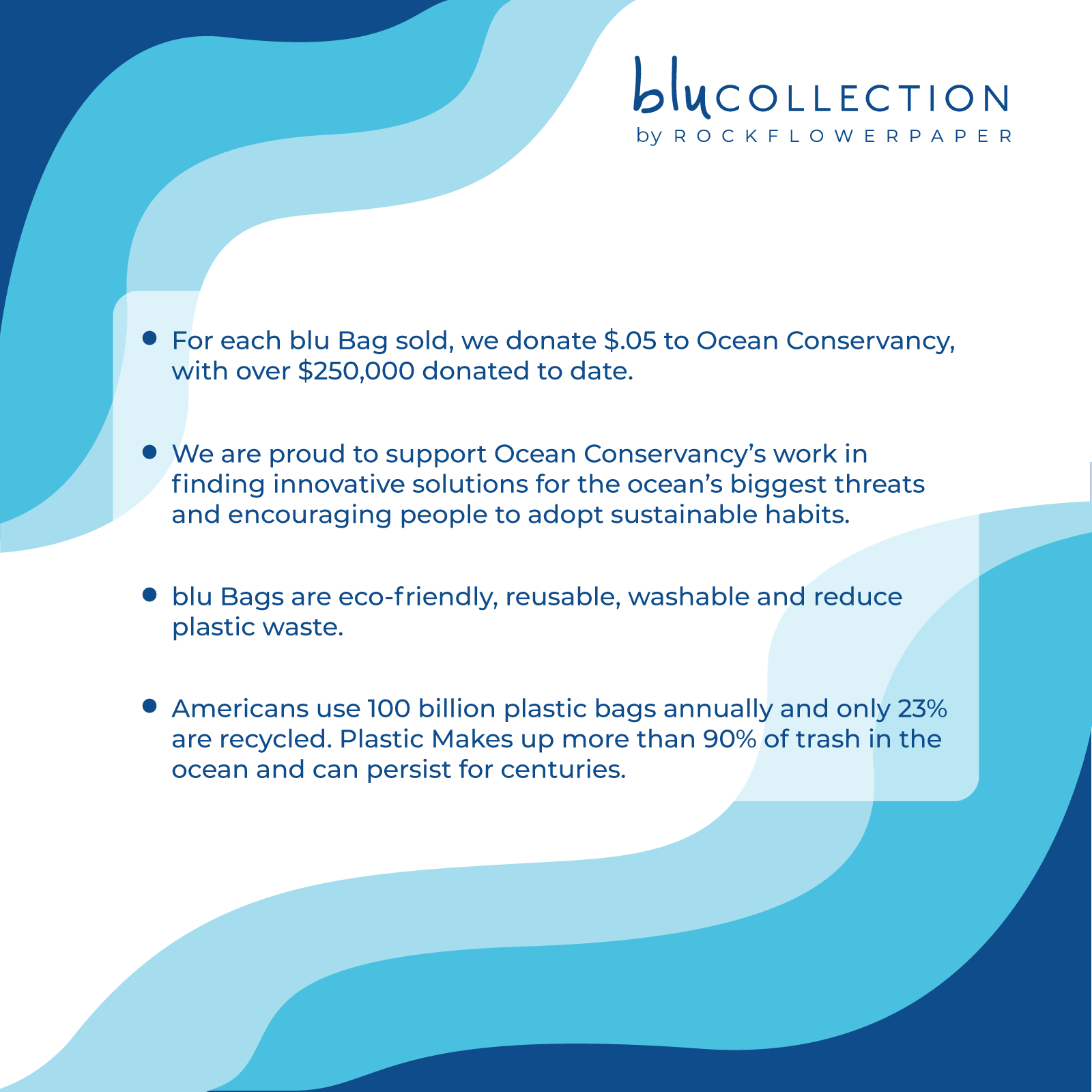 • durable for maximum reusability – 100% polyester • 19 x 24 inches – 1 bag holds the contents of 3 single-use plastic bags • strong - carries up to 50 lbs • machine wash; dries quickly • compact size stashes everywhere • free display box: heavyweight cardboard, 13.5” L x 9” W x 2.5” D. We donate 5 cents per bag to Ocean Conservancy for every Blu Bag Reusable Shopper sold.