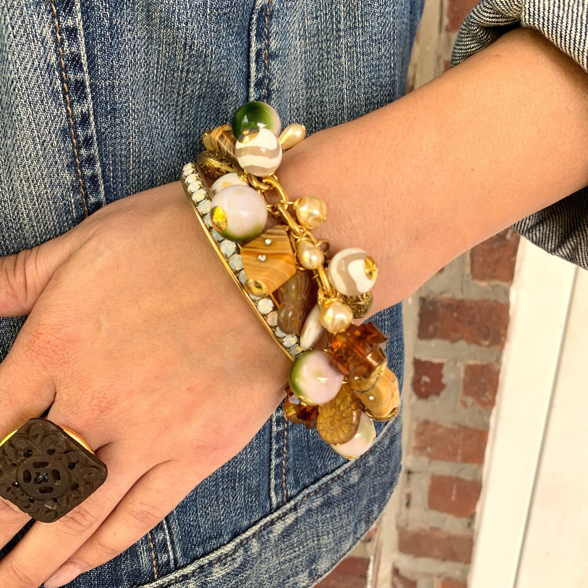 Earth tone chunky charm bracelet with a rich mix of beads, semiprecious stones, and Czech glass beads to elevate your unique style. These fascinating beads are wire wrapped to perfection on our signature brass plated chain to create a unique handmade bracelet for women. So many wardrobe pairing options with this fall bracelet. 8"L with lobster clasp.