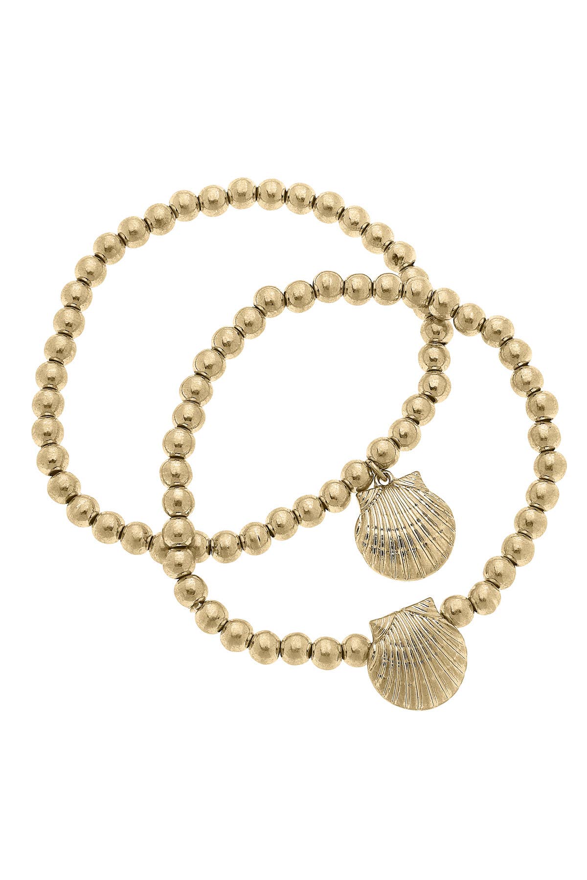 Double the charm with the Perla Cockle Shell Ball Bead Bracelet Set. These shiny gold bracelets feature intricate shell accents and bead details, perfect for stacking or wearing solo.