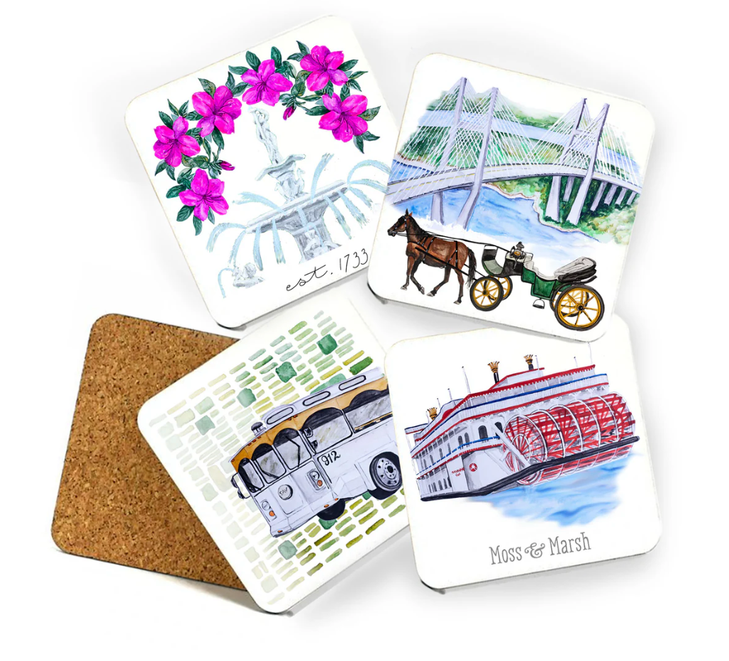 Show your love for Savannah, GA on your coffee table with these coasters featuring our original watercolor paintings!