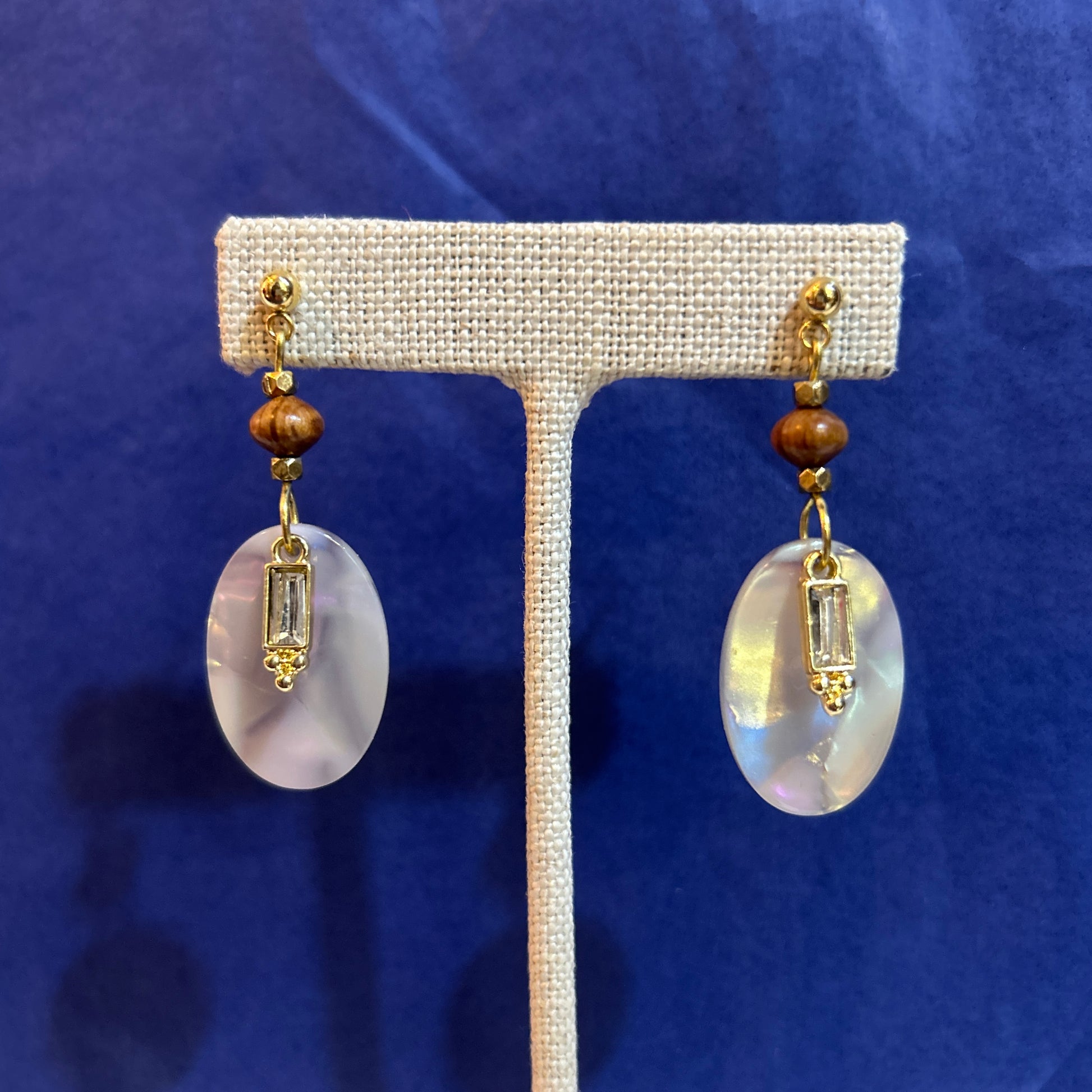 Earrings made from reclaimed American white oak bourbon barrels and light multicolored tortoiseshell acrylic acetate. Lightweight and easy to wear. Nickel and lead-free.