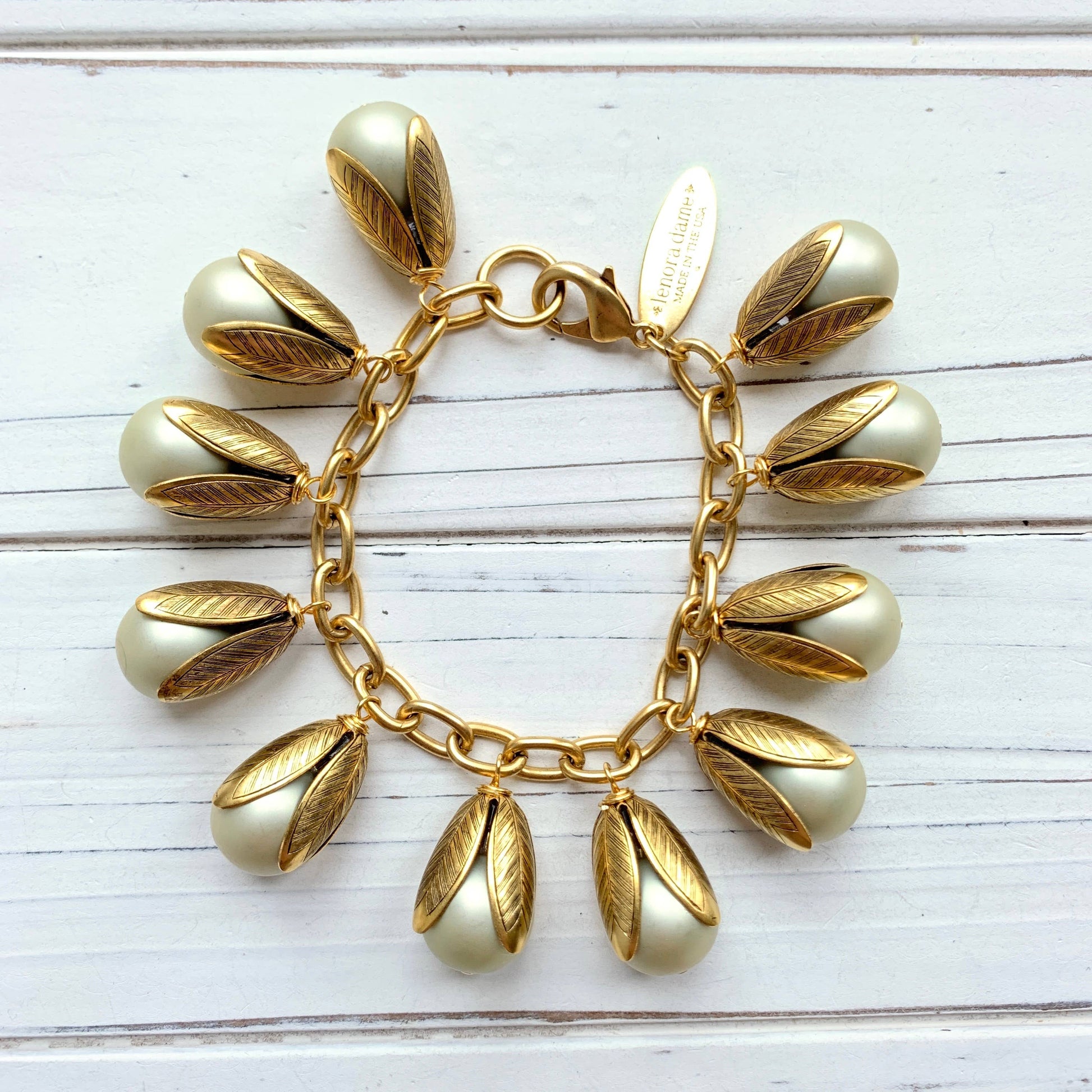 Sophisticated bracelet with glass-based matte pearls encased in the Lenora Dame signature floral etched brass bead cap. 8"L with lobster clasp. Handmade in the USA.